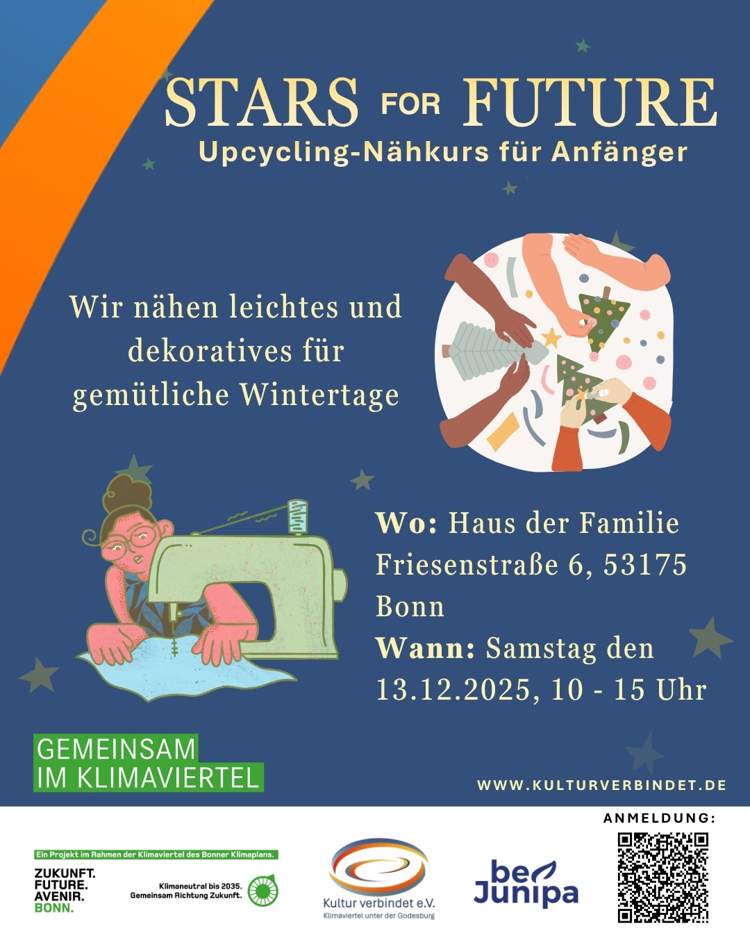 Unter Anleitung der Modedesignerin Oriana Baur entstehen in entspannter Atmosphäre aus alten Stoffen kleine Geschenke wie Tassenuntersetzer, Anhänger oder Duftsäckchen.Bei Tee und Plätzchen verbringen wir einen entschleunigten Samstag, an dem Kreativität, Nachhaltigkeit und gemeinsames Arbeiten im Mittelpunkt stehen.