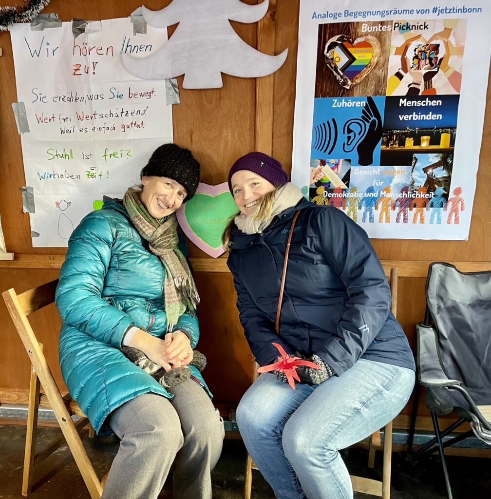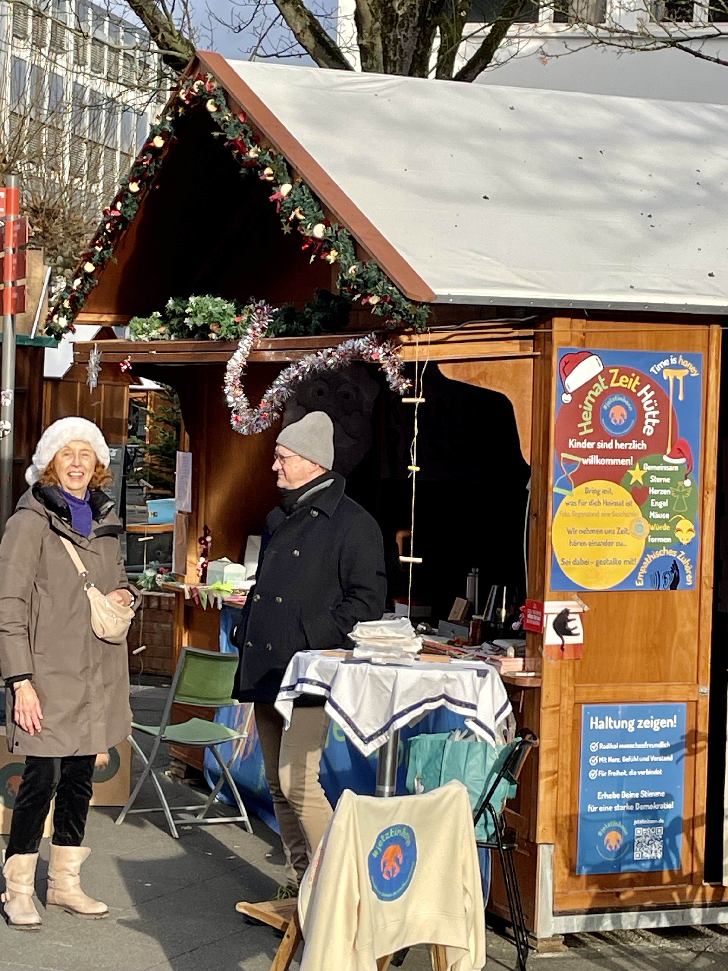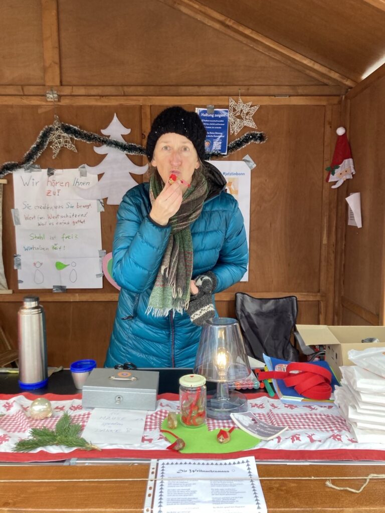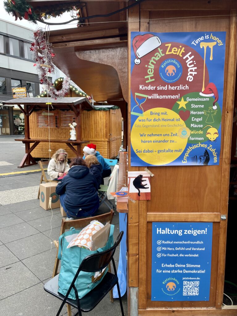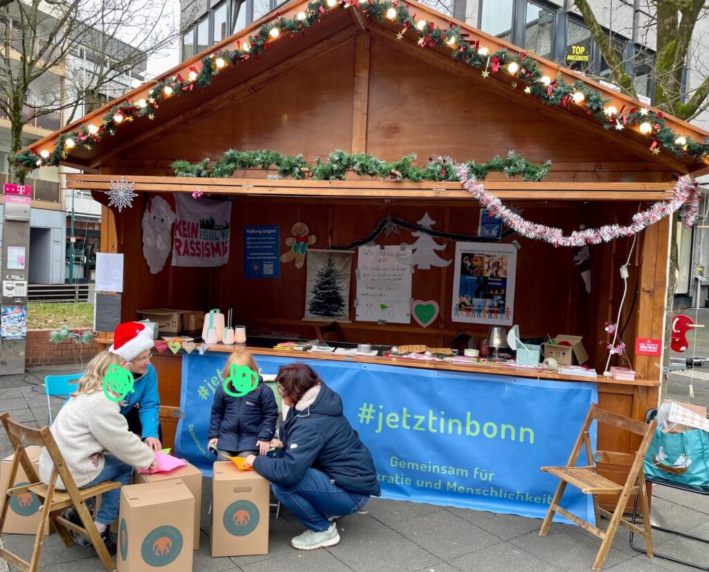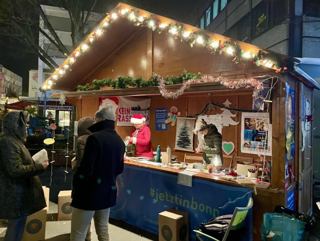 #jetztinbonn – Gemeinsam für Demokratie und Menschlichkeit hat letztes Jahr an einem Sonntag im Dezember auf dem Nikolaufmarkt in Bad Godesberg die Vereins-Hütte gemietet. Wir haben mit unseren Besucher*innen Engel, Herzen, Sterne und Mäuse gebastelt, uns ausgetauscht zum Thema Heimat und gemeinsam Würde geformt. In der Galerie findet Ihr ein paar ausgewählte Momente der Gemeinsamkeit.